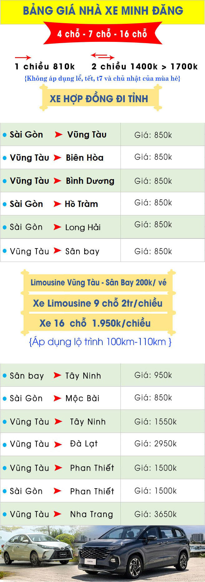 Với nhiều năm hoạt động trong lĩnh vực taxi du lịch – vận tải. Nhà Xe Minh Đăng luôn nỗ lực không ngừng để phục vụ khách hàng ngày càng chuyên nghiệp hơn. Đảm bảo chất lượng dịch vụ uy tín với giá tốt nhất.